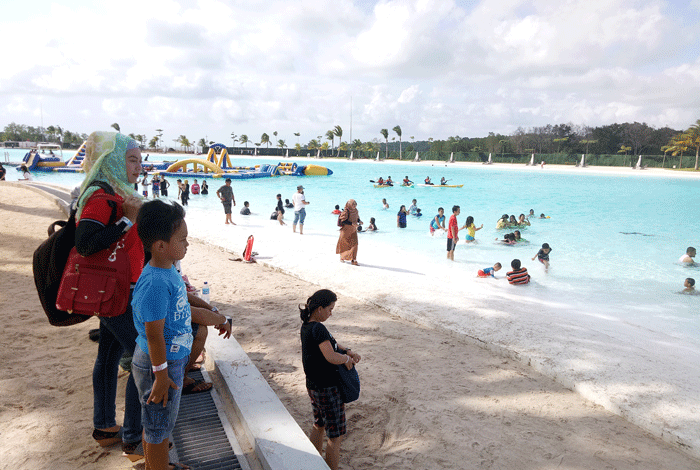 Kolam raksasa berkonsep pantai di Treasure Bay Lagoi, Bintan. Wisatawan lokal maupun internasional menikmati permainan wahana air di tempat wisata tersebut. Foto: cipi ckandina/batamps
