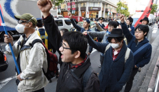 Untuk mendukung aksinya, anggota Kakuhido membawa spanduk-spanduk berukuran cukup besar.