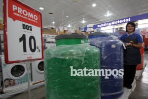 Karyawati Mitra 10 Batamcenter Ria menunjukan tanki air Dos yang ditawarkan dengan harga promo 10 persen kepada pelanggan, Minggu (19/2). F Cecep Mulyana/Batam Pos