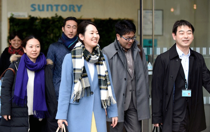 Karyawan perusahaan Suntory di Tokyo, Jepang, pulang kantor pada pukul 15.00, Jumat (24/2). (AFP PHOTO/TORU YAMANAKA)