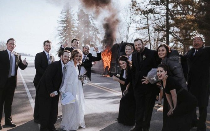 Begitu semua penumpang keluar, bus itu terbakar hebat. Beruntung tidak ada yang terluka dan ayah mempelai adalah mantan petugas pemadam kebakaran. Bantuan pun dipanggil. Dan, alih-alih panik, mempelai beserta para tamu malah menjadikan bus yang terbakar itu sebagai latar belakang foto. (*/tia)