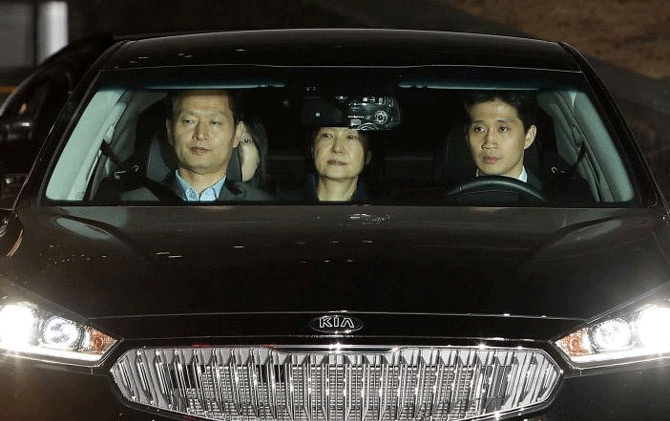 Dengan menumpang sedan hitam, perempuan 65 tahun itu memasuki gedung penahanan di dekat Seoul, Korsel. Penahanan dilakukan setelah Pengadilan Distrik Seoul Tengah mengabulkan permintaan jaksa penuntut untuk menahannya.