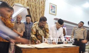 batampos.co.id – Bupati Karimun Aunur Rafiq, kemarin (30/3) menandatangani MoU pembangunan terminal Ferry International antara Pemerintah Kabupaten (Pemkab) Karimun, PT Pelindo I Medan dan pihak swasta Panbil Group Batam melalui anak perusahaan PT Jaya Annurya Karimun (JAK) di rumah dinas Bupati.