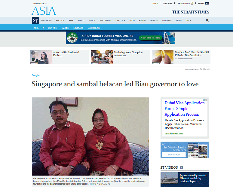 batampos.co.id – Kisah cinta Gubernur Kepri, Nurdin Basirun bersama Noor Lizah Mohamed Taib, menarik bagi negeri tetangga, Singapura. StraitTimes menuliskannya untuk pembaca di sana.