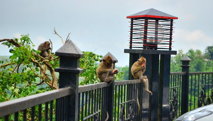 Yang mau menuju mulut goa harus melewati jembatan lalu menaiki tangga yang cukup panjang. Sepanjang jembatan dan tangga akan banyak kera yang lalu lalang. Seolah tidak takut dengan manusia. Ada kera yang besar ada yang masih anakan. Kera-kera bayi digendong induknya menjadi pemandangan yang unik. Ada yang bermesraan sambil mencari kutu kepada temanya.