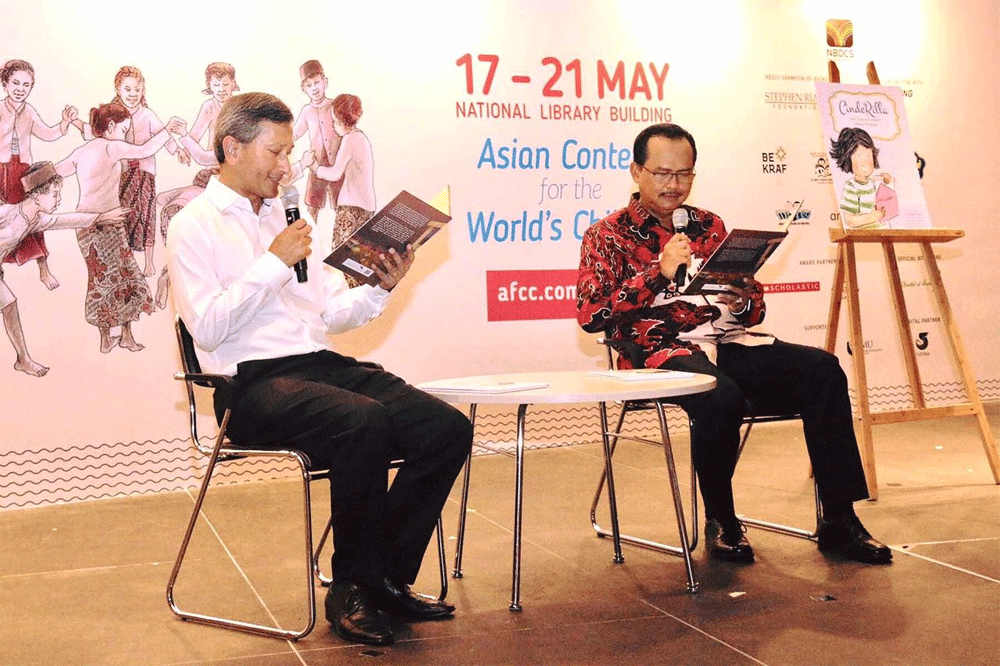 Dubes RI untuk Singapura Ngurah Swajaya (kanan) dan Vivian Balakrishnan, Menteri Luar Negeri Singapura saat membaca dongeng pada Indonesian Night 2017 di National Librarby, Singapura, 19 Mei 2017.