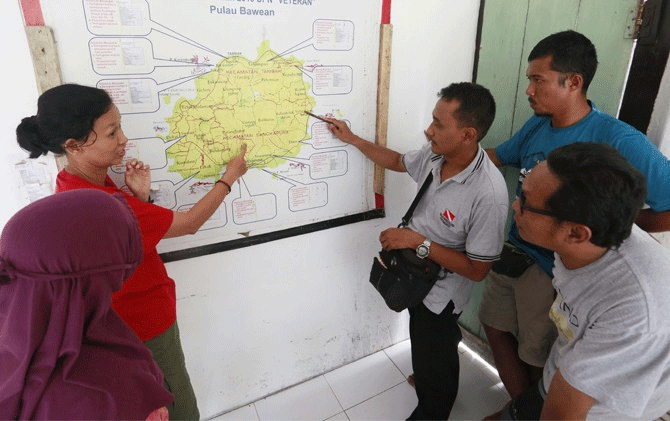 ”Karang masif itu karang yang berbahaya bagi kapal. Apa di sini banyak karang jenis itu?” tanya Heny kepada Hery yang sedang menjelaskan peta Bawean. ”Nanti bisa lihat sendiri saat survei lapangan, Mbak,” jawab Hery.