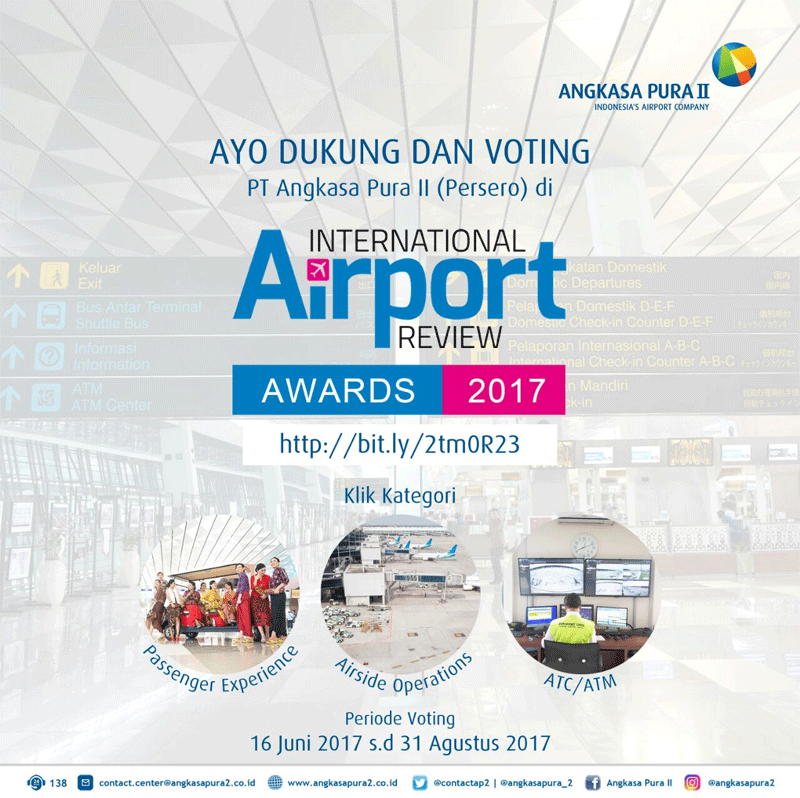 PT Angkasa Pura II (Persero) masuk dalam nominasi ajang International Airport Review Award 2017. Saatnya masyarakat Indonesia memberikan dukungan demi kebanggaan bangsa di kancah dunia.