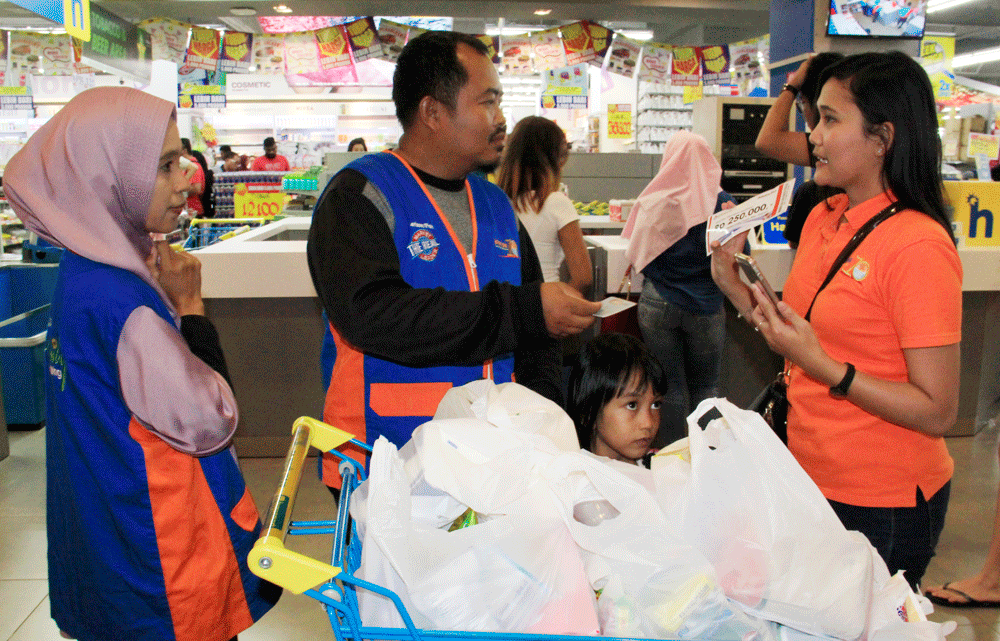 “Alhamdulillah, rejeki tak kemana. Ini yah stiker bonusnya kita dapat,” ujar Tri ke suaminya yang langsung memasukkan tisu tersebut ke troli belanjaannya di detik akhir.
