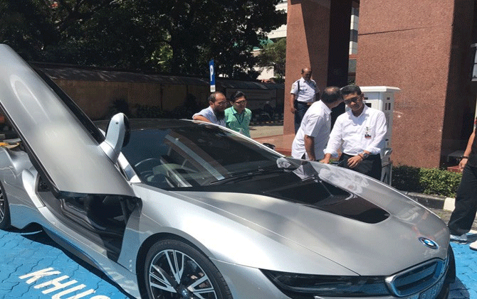 batampos.co.id – Sebuah mobil mewah BMW i8 nampak berada di parkiran mobil PLN, Senin (18/9/2017) Mobil ini menurut situs oto.com dibanderol Rp 3,5 miliar.