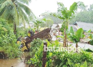 batampos.co.id – Kecelakaan tunggal terjadi di ruas jalan di Desa Sungai Ulu Natuna, Kamis (21/9). Satu unit Dum truk tergelincir dan meluncur ke dalam parit sedalam dua meter. Beruntung dalam kecelakaan tersebut, tidak menelan korban jiwa. Zakir,45 sopir truk hanya mengalami luka ringan. Namun Zakir sempat terjepit di dalam truk.