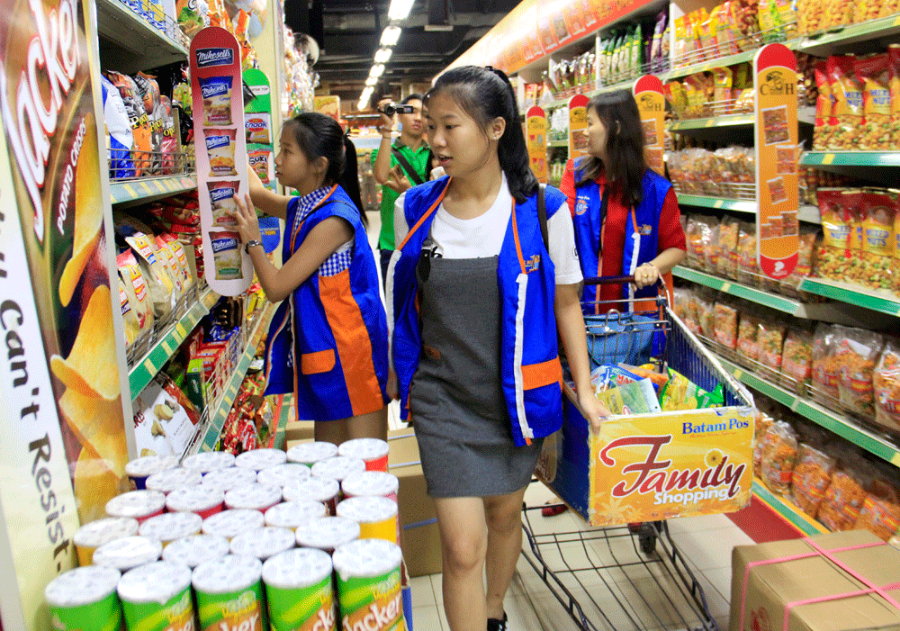 Beberapa produk belanjaannya dibolak-balikkan kemasannya untuk mencari stiker bonus Rp 250 ribu. Mereka kembali bergegas mencari barang belanjaan incaran lainnya.