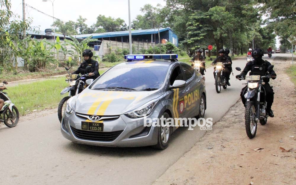Personel Brimob bersama mobil patroli Polsek Batuaji melintas di Jalan Brigjen Katamso, Batuaji melakukan patroli tindak kejahatan berupa begal, curas, jambret dan kejahatan lainnya, Minggu (15/10). Patroli dilakukan di pasar-pasar, tempat ibadah dan jalanan. F. Dalil Harahap/Batam Pos