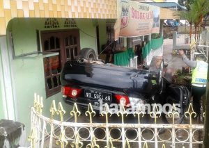 Diduga karena hilang kendali akibat jalan licin, mobil tersebut menabrak pohon dan pagar hingga terbalik di pekarangan rumah milik keluarga Sawir.