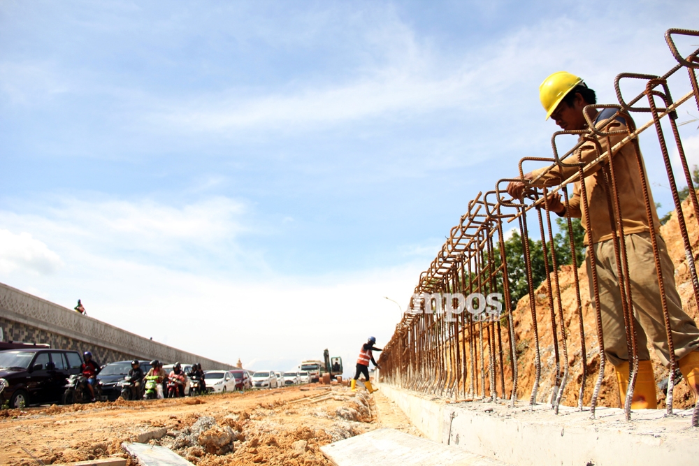 Sejumlah pekerja sedang memasang besi coran untuk pembuatan diding ditepi jalan Jembatan layang di Simpang Baloi, Minggu (5/11).  F Cecep Mulyana/Batam