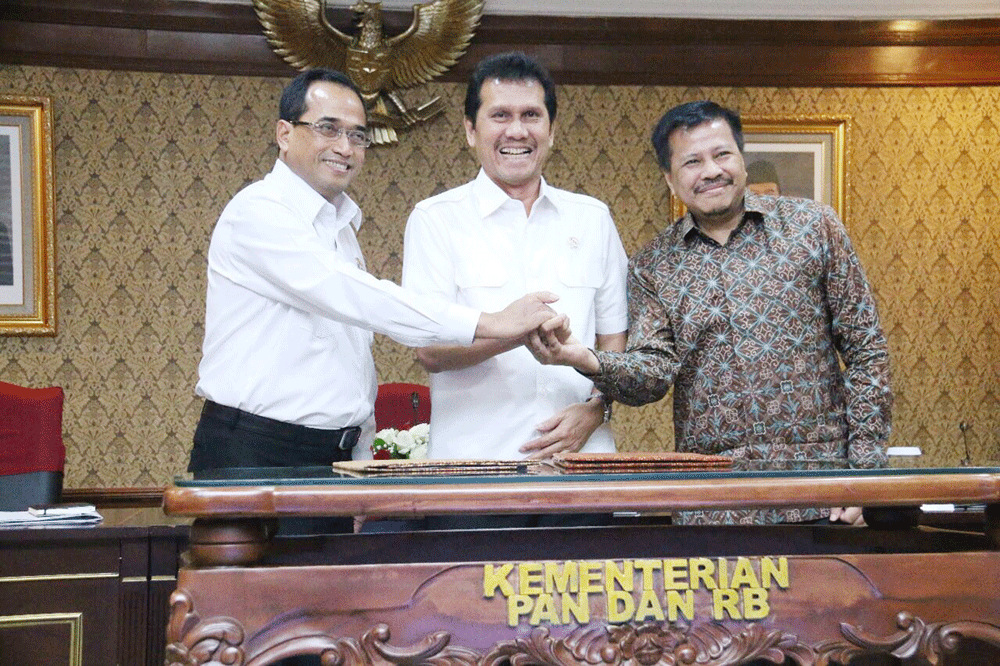 Pimpinan kedua lembaga resmi menandatangani keputusan bersama penyelenggaraan FTZ yang difasilitasi oleh Menteri Pemberdayaan Aparatur Negara dan Reformasi Birokrasi (Menpar RB), Asman Abnur, di kantor Kemenpan RB.