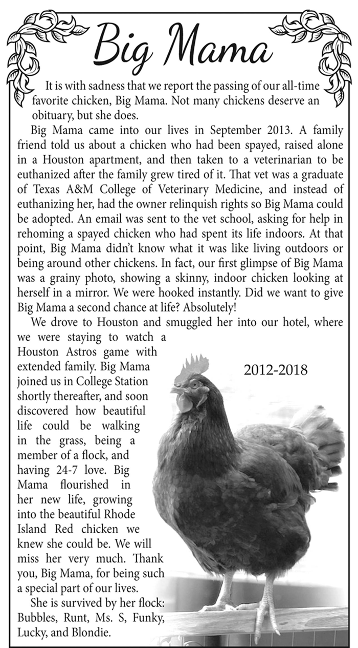 Big Mama, demikian nama ayam berbulu cokelat itu. Ia diadopsi Stephanie dan Gregory pada 2013 ketika usianya setahun. Big Mama diadopsi di salah satu pusat perlindungan satwa di Houston setelah pemilik sebelumnya tidak bisa lagi merawatnya.