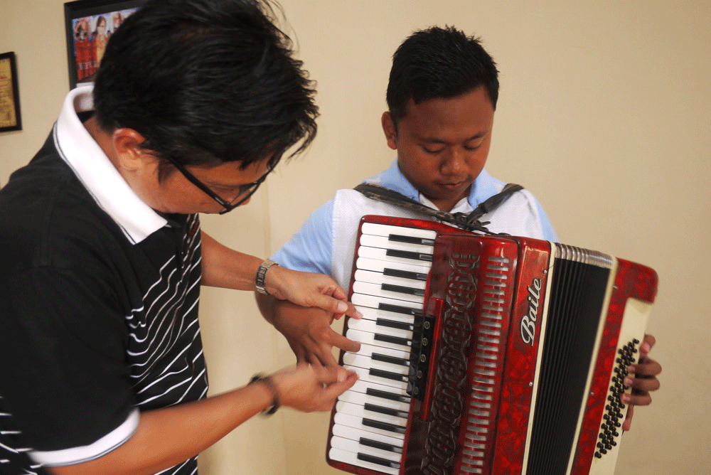 Budi Kailani, pemilik orkes Fasola Irama Melayu mengajarkan accordion pada putra sulungnya, Muhammad Desrial Ramadhan ( 16) di rumahnya di Taman Mediterania blok KK8 no 16 Batam Center, Batam.