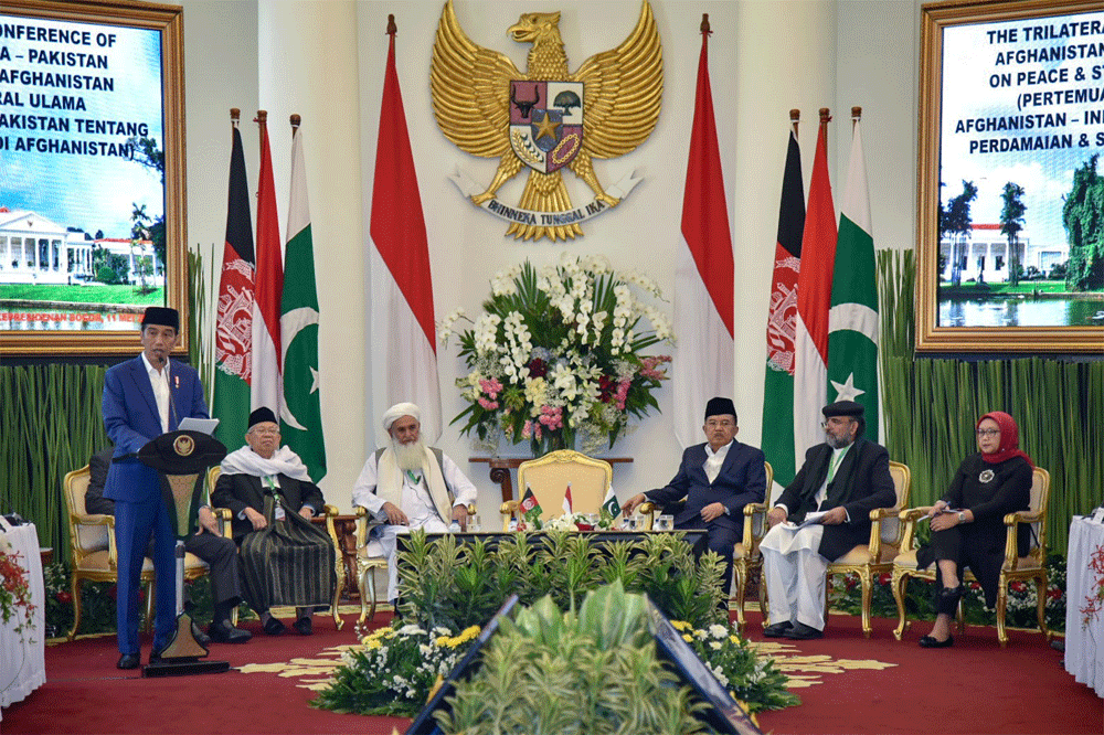 Pembukaan Pertemuan Trilateral Ulama Indonesia, Afghanistan, dan Pakistan itu dihadiri oleh Wakil Presiden Jusuf Kalla, Ketua Majelis Ulama Indonesia (KH) Ma’ruf Amin, Menko Polhukam Wiranto, Menteri Luar Negeri (Menl) Retno Sumardi, dan Menteri Agama Lukman Hakim Saifuddin. (UN/AGG/ES)