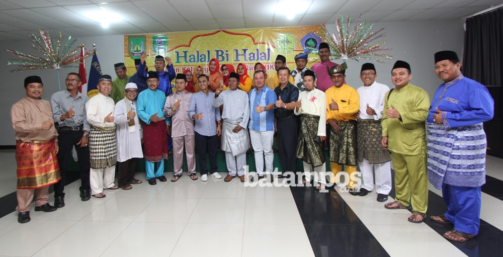 Dirut Batam Pos Chandra Ibrahim (enam kiri) berfoto dengan Ketua Ikatan Keluarga Besar Natuna Anasrun (tengah), pengurus dan undangan pada acara halal bihalal IKBN kota Batam di aula Rumah Sakit Budi Kemuliaan, Minggu (15/7). F Cecep Mulyana/Batam Pos