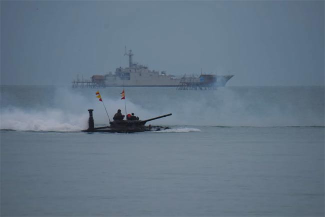 Latihan tempur ini diawali dari 17 KRI yang merapat di perairan Singkep, dilanjutkan dengan aksi pendaratan sejumlah alusista ampibi.