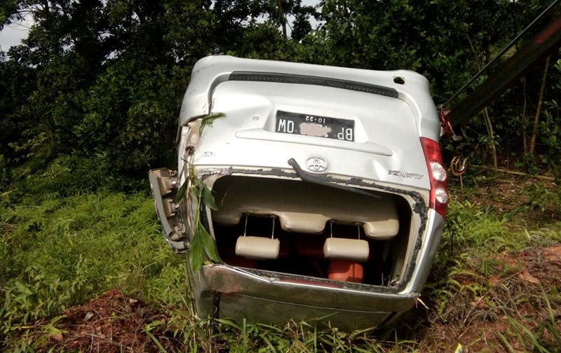 Diduga kondisi jalan yang menurun dan menikung membuat mobil terperosok masuk ke semak semak di sebelah kanan jalan.