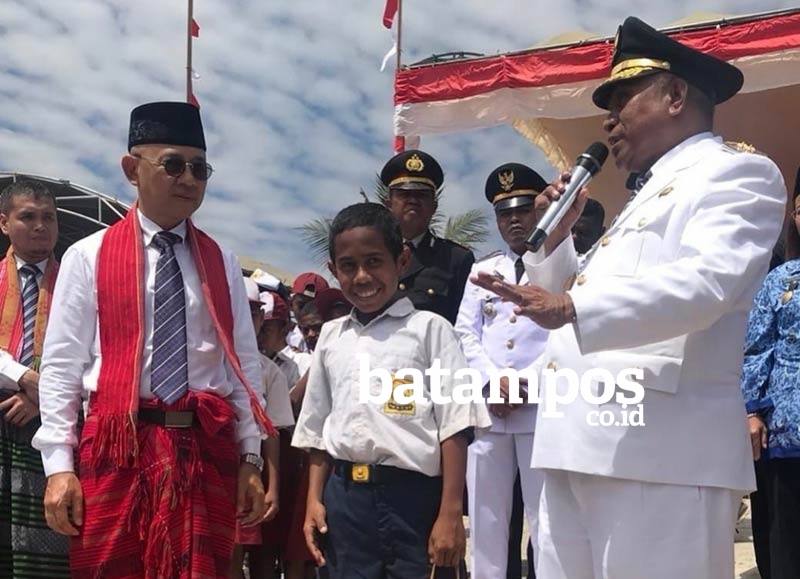 Sesampai di bawah, sejumlah aparat sudah menunggu. Si bocah lantas diajak ke podium kehormatan tempat Wakil Bupati Ose Luan berada. Bocah itu adalah Johni yang nyaris tak bisa ikut upacara karena sakit perut.