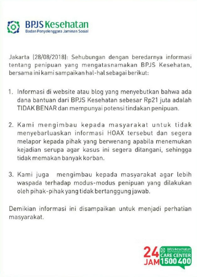 BPJS Kesehatan melansir bahwa info tersebut bohong alias hoax.