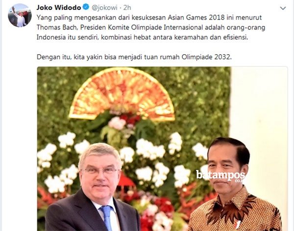 “Baru saja tadi saya bertemu dengan Presiden Komite Olimpiade Internasional Bapak Thomas Bach dan juga Presiden OCA Bapak Sabah. Beliau sangat menghargai dan kagum atas kesuksesan Indonesia dalam menyelenggarakan perhelatan besar Asian Games ke-18,” ungkap Presiden Jokowi di Istana Bogor.