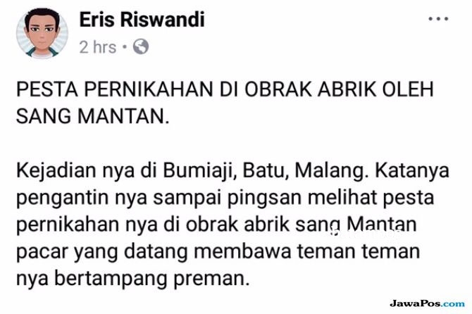 Di akun Eris Riswandi, video tersebut diberi penjelasan pesta pernikahan diobrak-abrik oleh sang mantan. Eris juga menuliskan sang mempelai laki-laki sampai pingsan melihat pernikahannya diobrak-abrik sang mantan pacar yang datang membawa teman-teman bertampang preman. Dia juga menjelaskan lokasi peristiwa itu terjadi di Bumiaji, Batu.