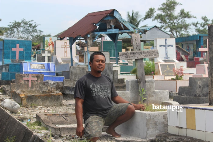 Mengenakan celana pendek loreng dan kaos oblong hitam, Naharuddin, 35, mencabut beberapa rumput yang kelihatan meninggi di atas kuburan di pemakaman kristen, Sei Temiang, Kamis (13/9) sekitar pukul 09.00 kemarin. Ia kemudian mengitari makam dengan kaki telanjang. Itulah pekerjaan rutin yang ia lakukan ketika tidak ada permintaan untuk menggali kuburan.
