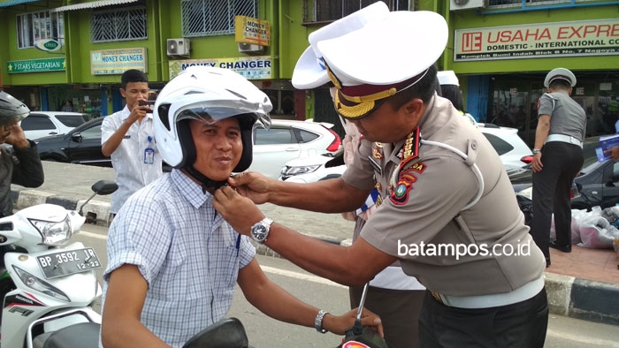 batampos.co.id – Dalam rangka Hari Lalu Lintas Bhayangkara ke-63 tahun 2018. Direktorat Lalu Lintas (Dit Lantas) Polda Kepri melaksanakan beberapa kegiatan. Salah satunya adalah kegiatan simpatik dengan membagikan 200 helm kepada pengendara yang melintas di Simpang Martabak Har, Lubukbaja, Senin (17/9) kemarin.