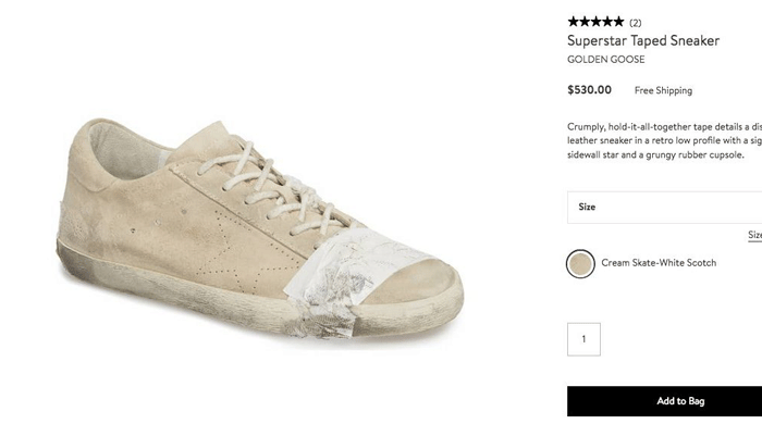 Jaringan ritel Amerika Serikat, Nordstrom, menghadapi kritik di media sosial karena menawarkan sneaker bermodel butut dan ditambal dengan selotip. Harganya USD 530 atau sekira Rp 7,68 juta. Oleh Golden Goose, merek sepatu papan atas asal Italia, seri alas kaki itu dinamakan Superstar Taped Sneaker.