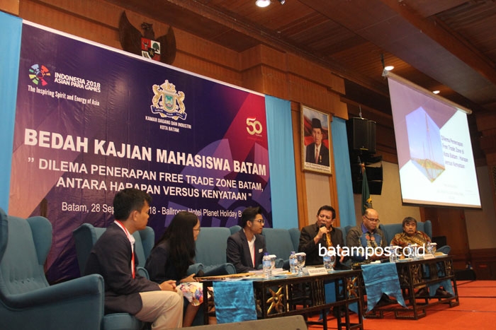 batampos.co.id – Kamar Dagang dan Industri (Kadin) Batam menggelar acara bedah karya tulis mahasiswa Universitas Internasional Batam (UIB) di Hotel Planet Holiday, Jumat (28/9). Karya tulis berjudul Dilema Penerapan Free Trade Zone di Kota Batam Harapan Versus Kenyataan itu merupakan juara pertama dalam lomba karya tulis ilmiah 2018 yang digelar Universitas Atmajaya Yogyakarta.