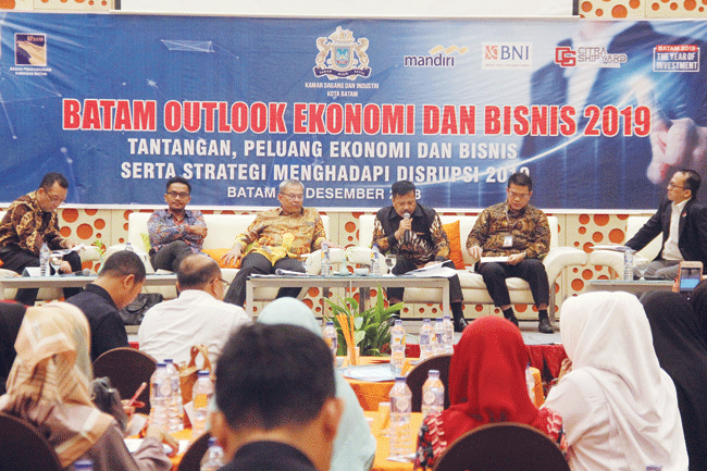 Kepala BP Batam Lukita Dinarsyah Tuwo bersama sejumlah narasumber memberikan pemaparan pada acara dailog Batam Outlook Ekonomi dan Bisnis 2019 yang diselenggarakan oleh Kadin Batam di Hotel Harris Batamcenter, Senin (10/12). F Cecep Mulyana/Batam Pos