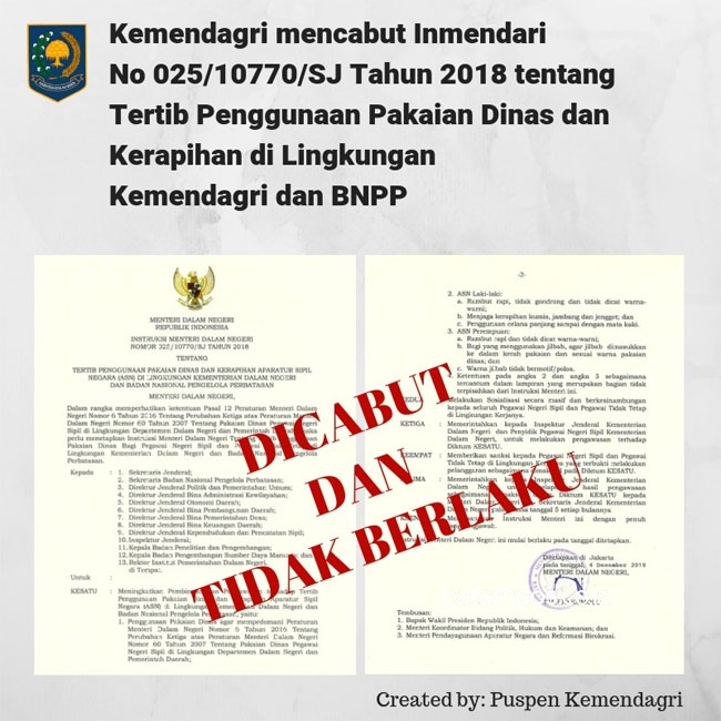 batampos.co.id – Kemendagri mencabut Instruksi Menteri Dalam Negeri Tjahjo Kumolo Nomor 325/10770/SJ Tahun 2018 tentang Penggunaan Pakaian Dinas dan Kerapihan Aparatur Sipil Negara di Lingkungan Kementerian Dalam Negeri dan Badan Nasional Pengelola Perbatasan.