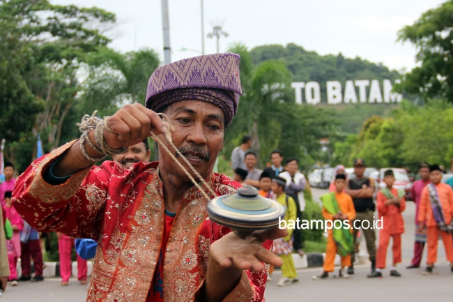 Abas salah seorang warga Belakang padang menunjukan kepiawaiannya saat bermain permainan tradisional gasing di jalan Engku Putri, Jumat (2/10/2018). Acara tersebut merupakan rangkaian Kenduri seni Melayu dalam rangka Hari Jadi Kota Batam. F Cecep Mulyana/Batam Pos