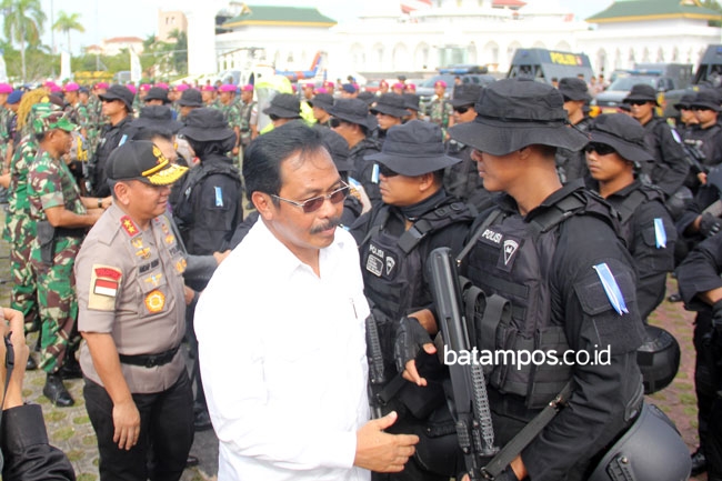 Pasukan Brimob bersama satuan jajaran Polda Kepri, dan TNI, Intasi mengikuti apel gelar pasukan Operasi Lilin Seligi 2018 di Dataran Engku Putri, Batam Center, Jumat (21/12).Operasi Lilin Seligi 2018 ini dalam rangka pengamanan Natal dan Tahun Baru 2019. F Cecep Mulyana/Batam Pos