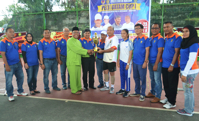 Kapolresta Barelang Kombes Hengki didampingi Plt Kepala Dinas Kebudayaan dan Pariwisata Kota Batam Ardiwinata menyerahkan piala kepada Ketua Pelti Batam Yazid dan ketua panitia Afrizam menandai dimulainya Pelti Batam Cup I di Lapangan Tenis Pemko, Jumat (21/12/2018).