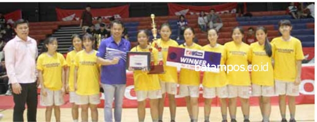 hadiah kepada tim SMA Maha Bodhi, juara pertama putri Batam Pos HSBL 2020, di Hi-Test Arena,