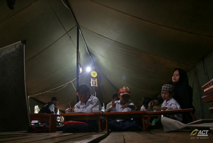 “Sekolah begini adanya untuk sementara, di satu tenda ini ada kelas 1, 2, sama 3. Sisanya ada di sekolah sementara yang baru dibangun,” ungkap Nisa, salah satu guru, sambil menunjuk ke arah bangunan baru sekolah darurat untuk kelas 4, 5, dan 6 yang posisinya persis di sebelah tenda tempatnya mengajar.