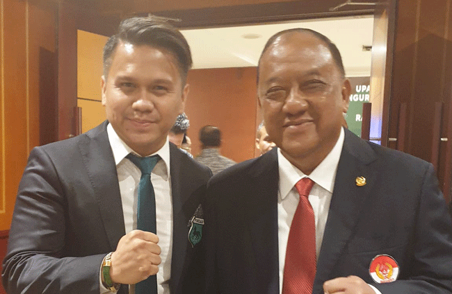 Osco Olfriady Letunggamu, bakaln calon Wakil Wali Kota Batam berfoto bersama Ketua Umum Komite Olahraga Nasional Indonesia (KONI), Letnan Jenderal TNI (Purn) Marciano Norman. Foto; Istimewa untuk batampos.co.id