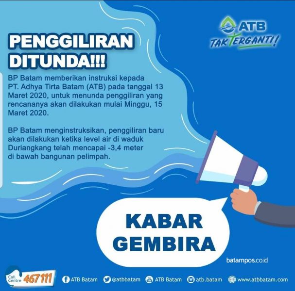 “ATB menerima instruksi baru dari BP Batam, untuk tidak melakukan penggiliran pada Minggu, tanggal 15 Maret 2020, sebagaimana telah disepakati sebelumnya,” ujar Head of Corporate Secretary ATB, Maria Jacobus. Instruksi tersebut dikirimkan secara resmi melalui surat tertanggal 13 Maret 2020.