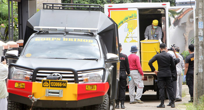 Tim Teknis Kimia Biologi Radioaktif Gegana Brimob Mabes Polri bersama Badan Tenaga Nuklir Nasional (BATAN) dan Badan Pengawas Tenaga Nuklir (BAPETEN) menemukan titik kedua area terpapar radiasi CS-137 di Blok A-22 Perumahan Batan Indah Serpong, Senin (24/2). Dari lokasi kedua tersebut, petugas mengamankan limbah barang-barang yang bermaterialkan metal, serta mengamankan anggota keluarga yang ada di dalam rumah. Foto: MUHAMAD ALI/JAWA POS