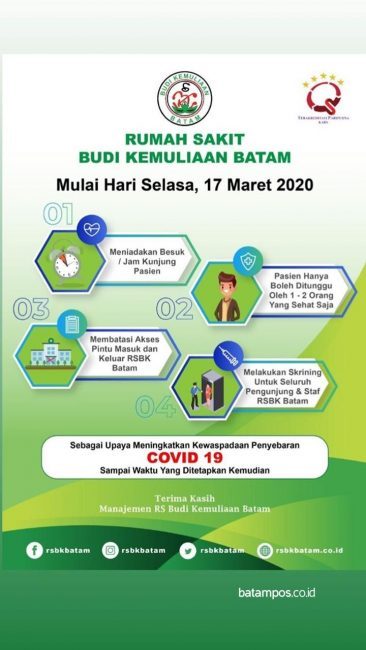 batampos.co.id – Rumah Sakit Budi Kemuliaan (RSBK) Batam meniadakan jam besuk dan diberlakukan mulai Selasa (17/3/2020).