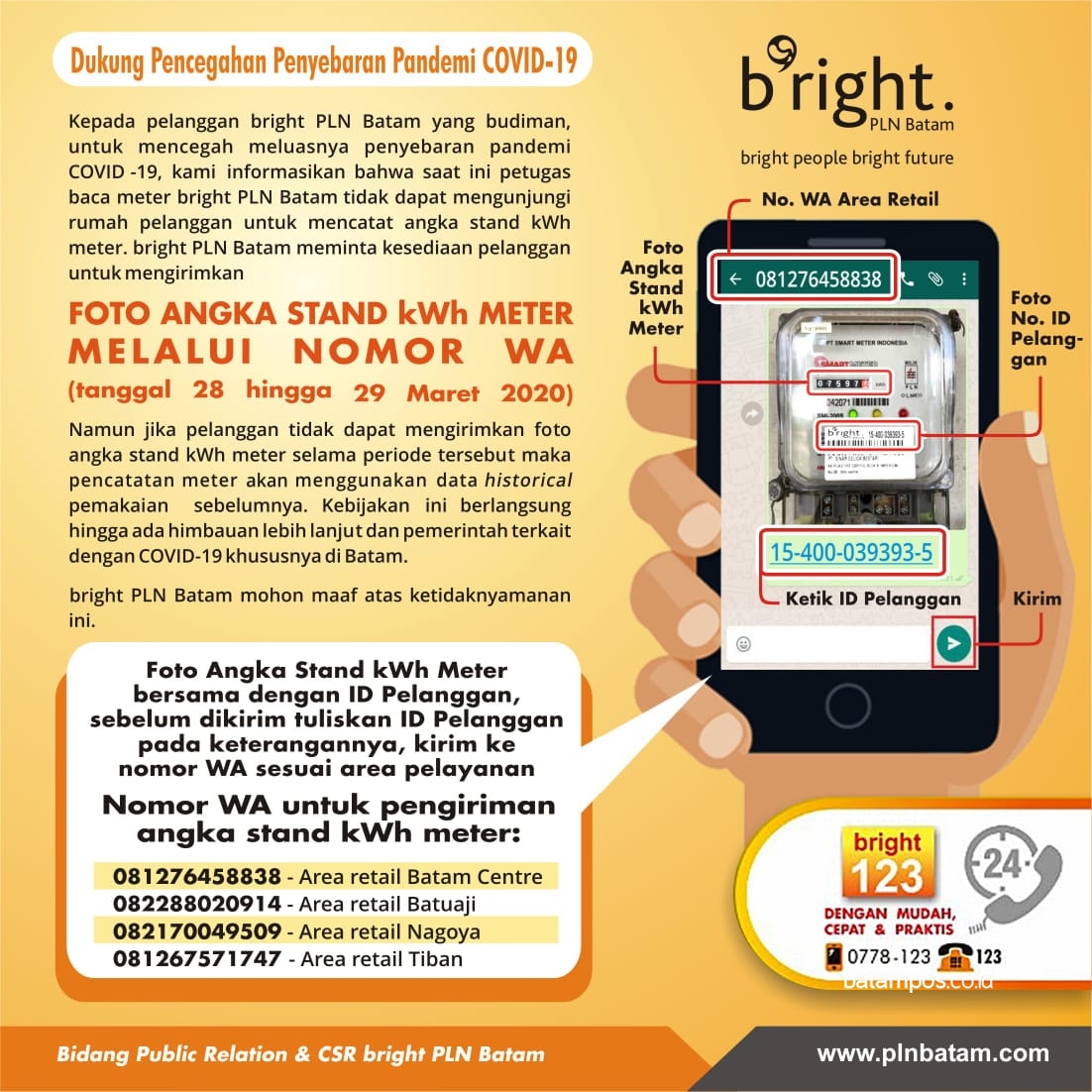 Pelanggan lanjutnya dapat mengirimkan foto angka stand kWh meter dengan menulis caption nomor ID pelanggan ke nomor Whats App (WA) di bawah ini sesuai area pelayanan/retail masing-masing :