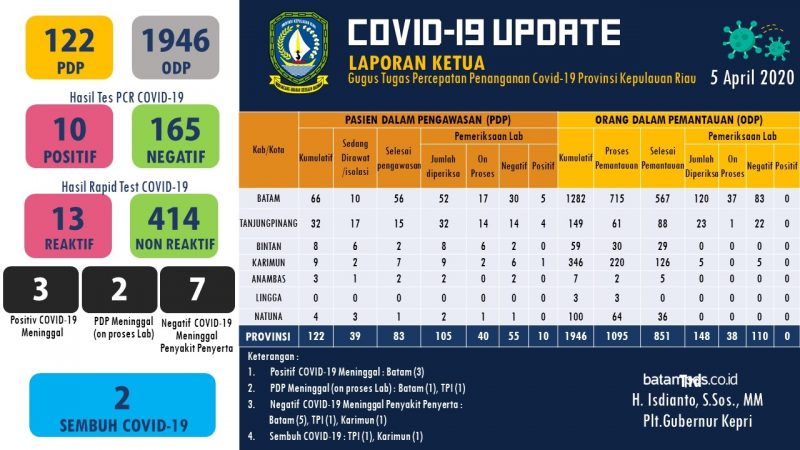 Sedangkan Orang Dalam Pemantauan (ODP) di Provinsi Kepri ada 1.946. Adapun rinciannya adalah 1.282 di Batam, 149 di Tanjungpinang, 59 di Bintan, 346 di Karimun, 7 di Anambas, 3 di Lingga, dan 100 di Natuna.
