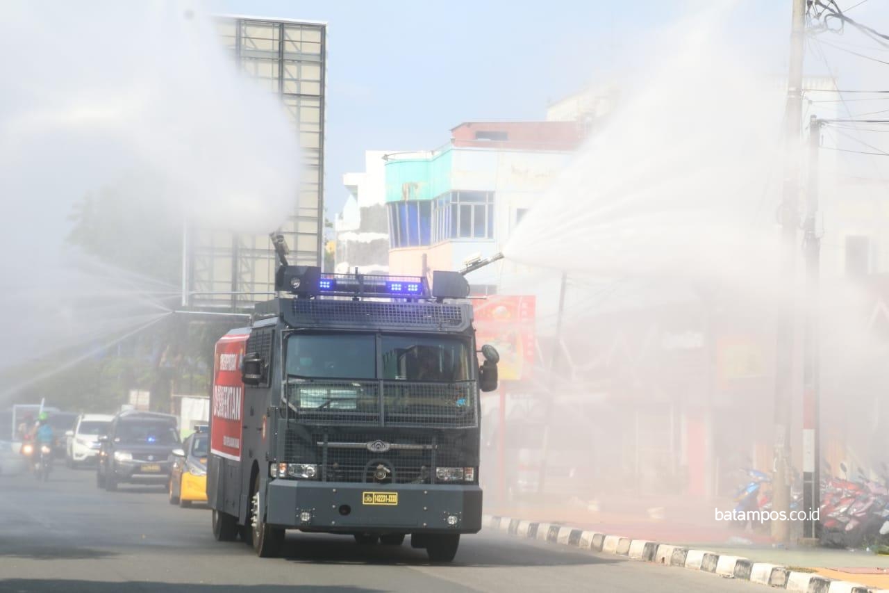 Water Canon milik Direktorat Sabhara Podla Kepri menyemprotkan cairan disinfektan di jalanan Kota Batam untuk meminimalisir penyebaran virus corona. Foto: Humas Polda Kepri untuk batampos.co.id