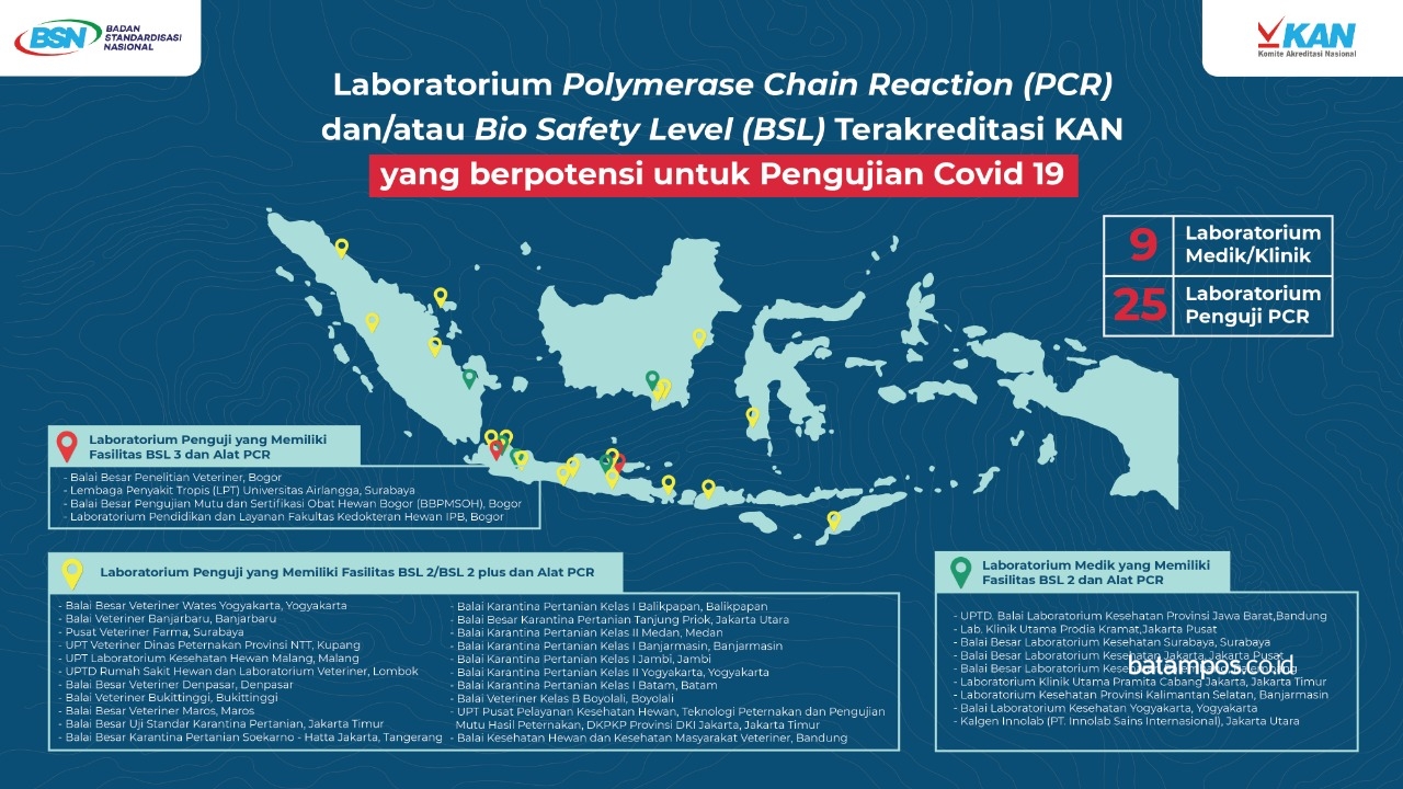 Sebagai informasi, KAN juga telah mengakreditasi laboratorium penguji dan laboratorium medik/klinik di luar jumlah tersebut di atas (9 lab medik/klinik dan 25 laboratorium penguji), dengan lingkup akreditasi menggunakan peralatan PCR namun belum memiliki fasilitas BSL.