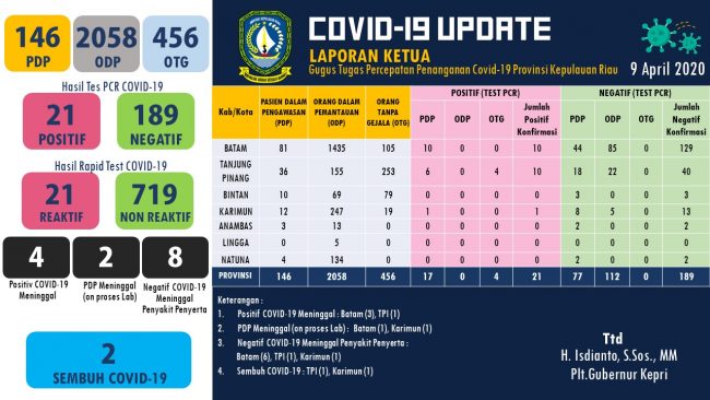 Data terbaru yang dirilis Tim Gugus Tugas Penanganan Covid-19 pada Kamis (9/4/2020), ini berdasarkan hasil tes PCR yang dilakukan di Kementerian Kesehatan RI. Sementara itu, Wali Kota Batam M Rudi dalam rilis yang disampaikan kepada wartawan, menyampaikan mendapat data hasil pemeriksaan Swab dari Badan Penelitian Dan Pengembangan Kementerian kesehatan RI, terhadap Pasien Dalam Pengawasan (PDP) yang pengambilan sample swabnya dilakukan oleh Tim Analis kesehatan Balai Teknik Kesehatan Lingkungan Pengendalian Penyakit (BTKLPP) Batam.